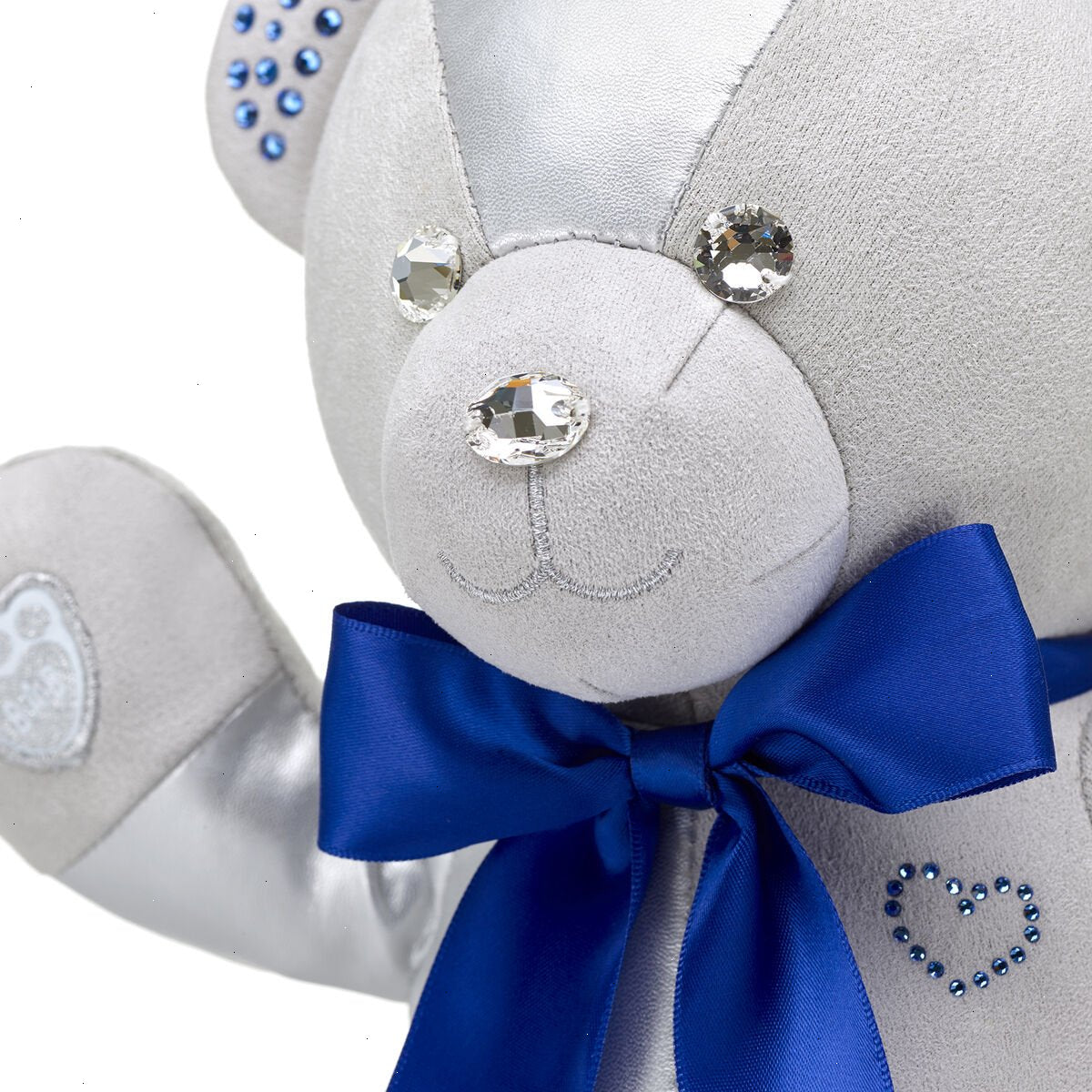 Birthstones are precious stones that correspond to different birth months. September birthdays will be dazzled with this gorgeous Build-A-Bear Birthstone Bear Featuring Swarovski® Sapphire crystals. Inspired by the birthstone of September, this collectible teddy bear has ultra-suede silver fur embellished with sapphire-colored Swarovski® crystals on its face, ears and paw pads. This shiny bear also has a matching gift bow, a heart crystal stitched on its chest and comes in a beautiful gift bag with the Swarovski authenticity seal. This deluxe collector's item makes a stunning birthday gift or a one-of-a-kind keepsake for yourself.